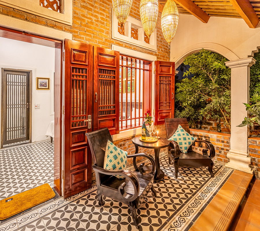 Each room offers a distinct atmosphere, with some featuring windows that open to garden and pool views, creating a calming ambiance.